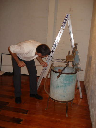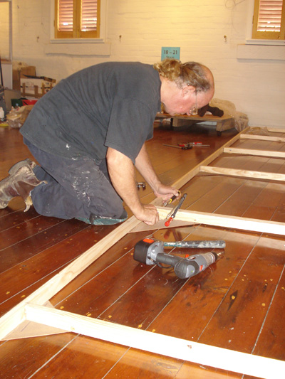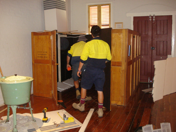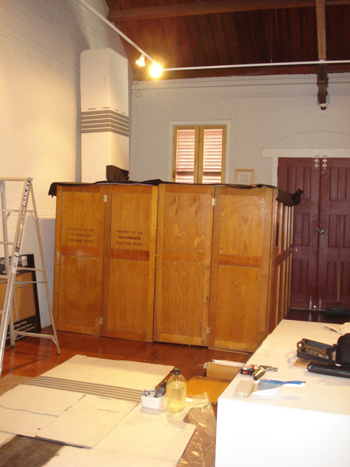 For the group exhibition David’s installation was housed in a strange tardis-like construction made from old wooden election booths, which is shown under construction below.