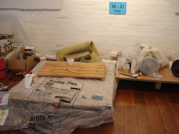 The collection of moulds was stored in several locations and had recently been moved because of floods. This necessary portability provided a departure point for the notion of a portable or traveling museum. Rough timber transport palettes pose as a microcosm of museum space that theoretically can be moved from place to place and re-assembled in various ways.