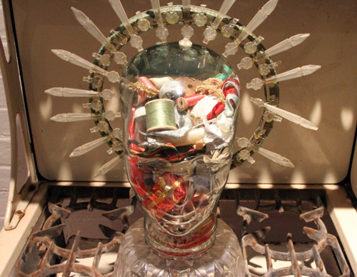 An old stove from Mavis Bank collection, included in Christine’s solo exhibition was adorned with richly decorative biscuit tins, reminding us again of the importance of exterior appearances that may have little to do with the contents. Also on the stove a womans head, idealised with a tiara or halo made from old chandelier pieces. But this goddesses head is not filled with mystical or heavenly thoughts- just the everyday tasks of sewing and mending. The sorts of things mothers think about while they cook?