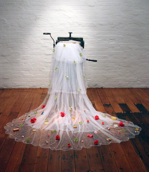 Her work in the Collective Insites group exhibition explored the intersection between the private and public faces of women and between the reality and the dream. Objects of household drudgery from the Mavis Bank collection were juxtaposed with symbols of refinement and romanticized notions of womanhood. Her transformation of machines from the Mavis Bank collection reminds us of the meaning we find in objects from the past. Their inclusion in an art gallery exhibition, transformed by the artist raises our perceptions of these objects from mere curiosities with long gone practical uses to symbols of wider and more esoteric stories.